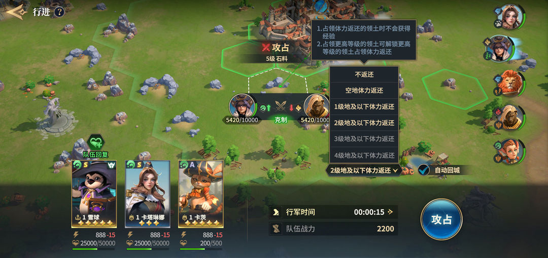 Tips:当选择攻占土地时记得勾选返还体力,这样打一些低级地就可以用主力铺路,非常节省时间。