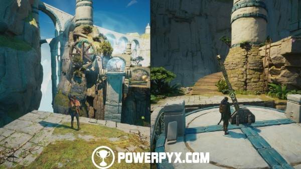其中一名玩家跳下平台,另一名玩家使用拉杆后再跳下平台。