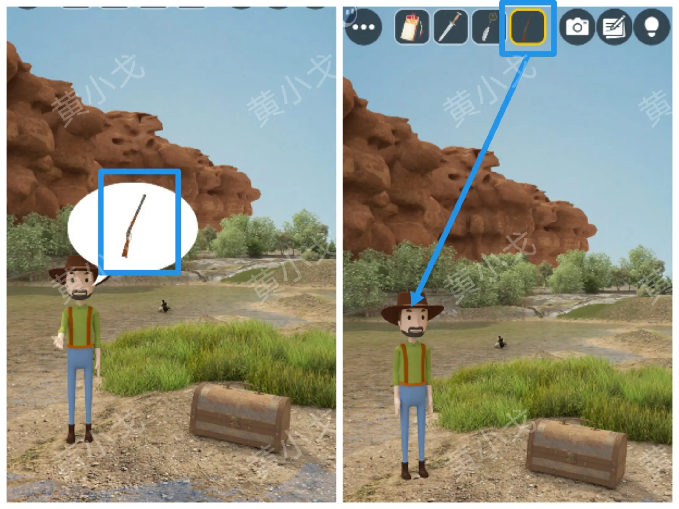 21.点击绿色衣服男人,得知他需要猎枪;拿【猎枪】给他,赶走鸭子