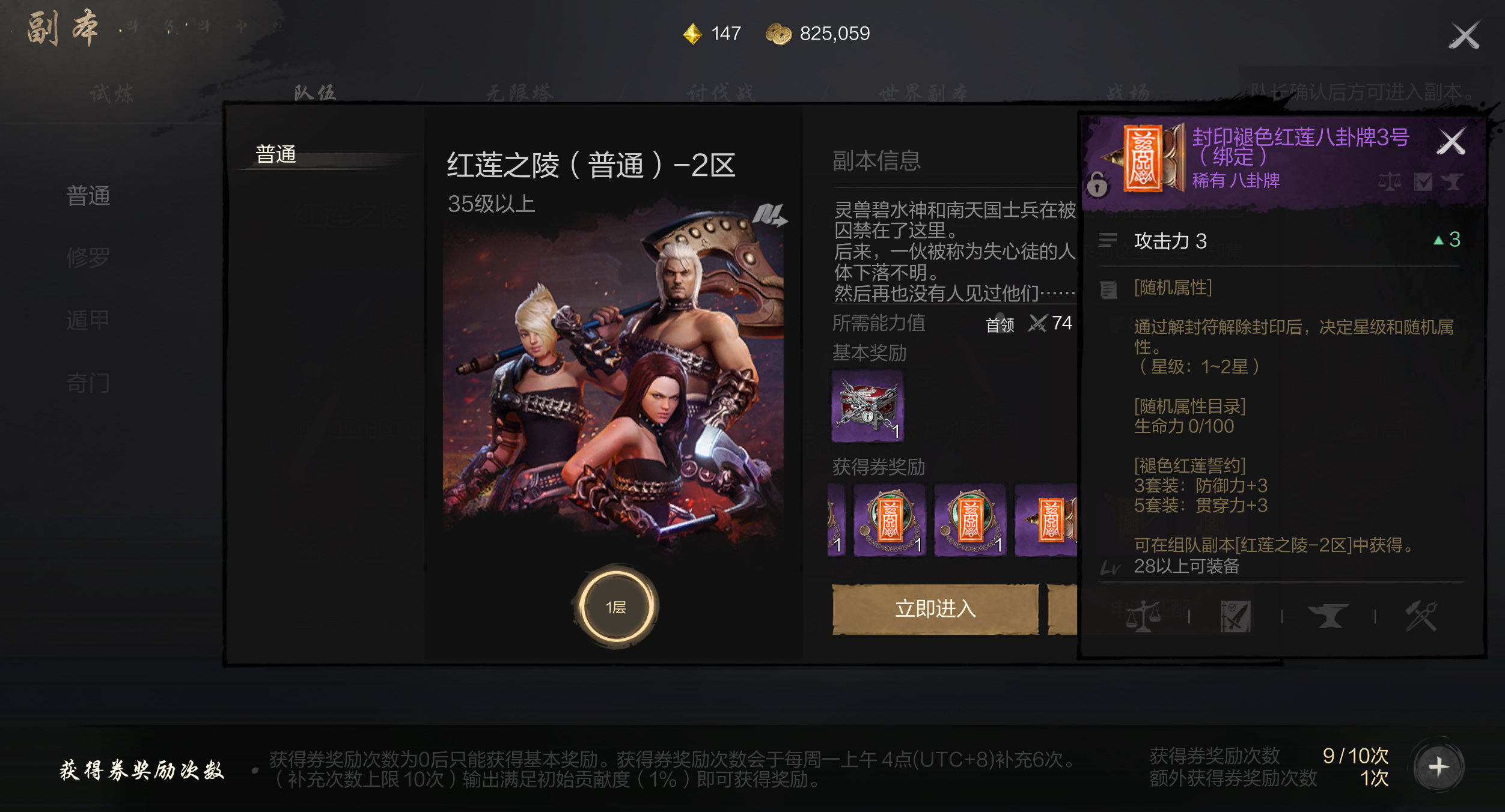 红莲之陵(初入)-1区的副本流程比较简单,到达了等级后组队打没有难度,群殴副本BOSS就能过,整个流程就是打怪推一个BOSS;红莲之陵(普通)-2区的流程也并不难,组队起来在BOSS关卡里集中灭杀一个就轻松了;红莲之陵(困难)-3区也是需要组队才能好过的副本。