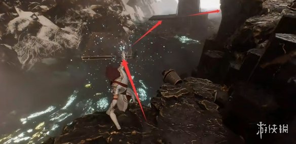 过来后转身,从左手边的路朝着下图所示箭头的方向一直往前走,遇到钩索就利用一下。