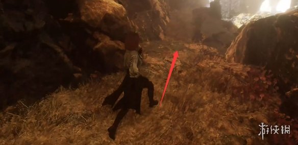 过来后,顺着箭头的方向走,上坡,到半山腰的时候,视角往左边看,走到尽头有向下的绳索。