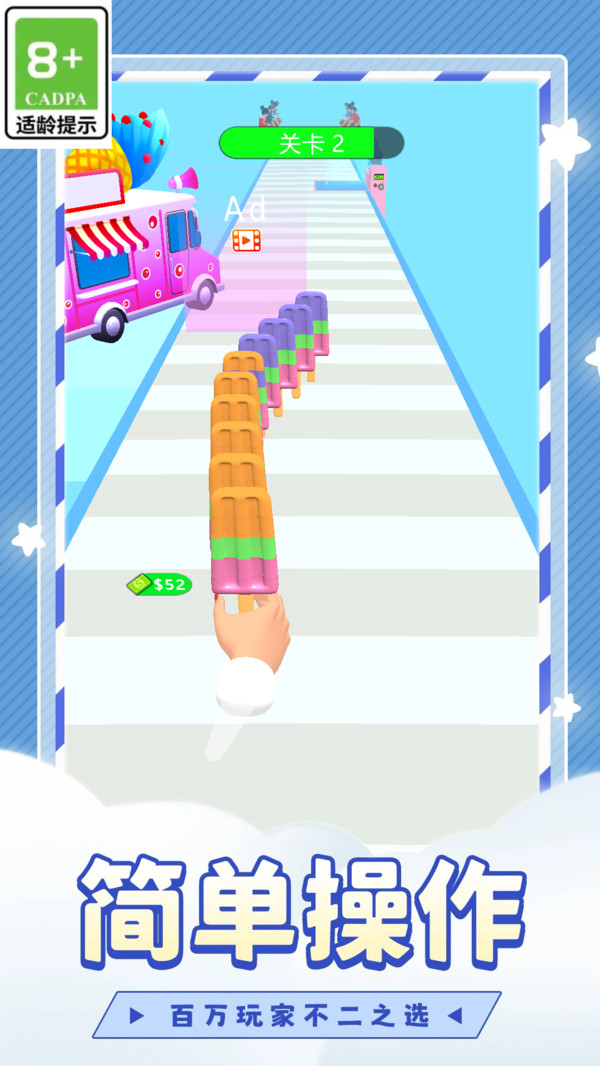 1、独特角色设定,玩家扮演冰淇淋大师,职业与跑酷结合新颖有趣。